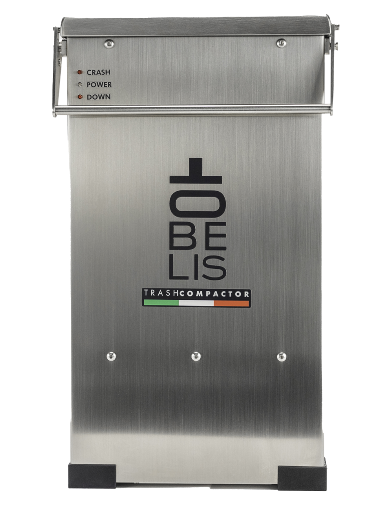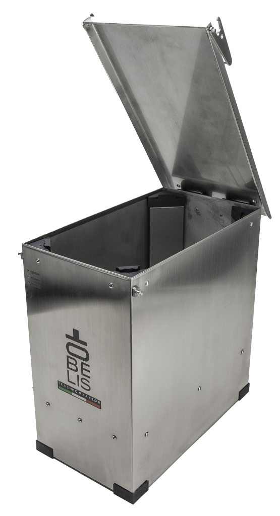 Si tratta di una pattumiera compattatrice, utilizzabile come una qualsiasi altra con in più la funzione di compattazione. Normalmente la sua capienza è da 3 a 4 volte superiore a quella di un normale contenitore di pari ingombro. L’effettivo rapporto di compattazione dipende dalle caratteristiche di quanto introdotto. Il prodotto è realizzato in acciaio 304 inox e altri materiali plastici resistenti ad eventuali effetti corrosivi dell’ambiente circostante (salsedine). Prevede l’alimentazione diretta a 12 V. È anche dotato di un alimentatore da utilizzare su corrente 100-240 V˜ con trasformatore a 12 V. Il principio di funzionamento consiste nella salita del fondo che comprime il contenuto tra il fondo stesso e il coperchio.